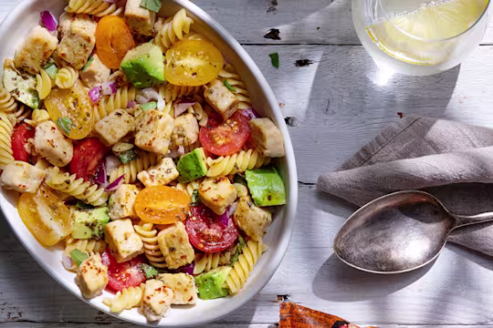 - In a large bowl, add Quorn Pieces, avocado, pasta, red onion, cherry tomatoes, and fresh basil.